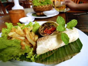 Wrap met gegrilde groenten (paprika, aubergine, ui, komkommer)
